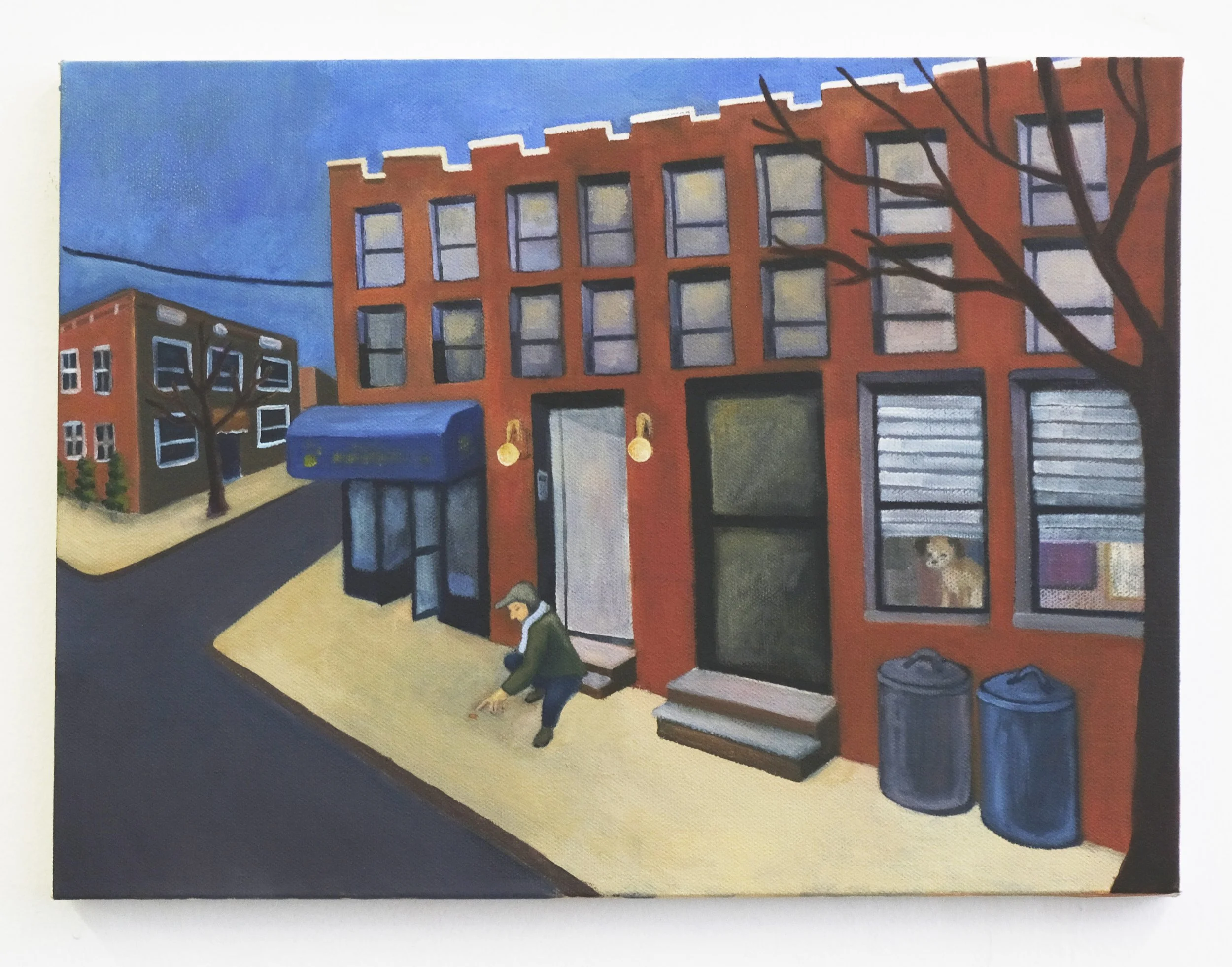 It’s been a productive couple of weeks in terms of exploring new mediums. My time spent painting has been at a minimum, actually– besides today, which I will get to. Instead of painting, I have been spending a lot of time in the print shop at the Art Students League developing some lithographs. This has been extremely exciting for me. The process is a lot more physical and scientific than I ever expected. My first day in the class was entirely spent grinding two heavy slabs of limestone together for four hours until they were both perfectly flat. Then I finally started to get an image on there. One of the main reasons I was interested in trying printmaking in the first place is because I wanted to see how the medium could transform my paintings. With lithography in particular, I’m interested in getting a better understanding of value composition. I am hoping that learning lithography will enhance my paintings and vice versa. So, for my first lithograph, I tried adapting this street scene I painted earlier this year into a black and white image. I also took the figure out, since I have an idea to animate on top of one of the prints I turn out. I may try hand coloring a couple of them too with watercolor or Ecoline inks.: